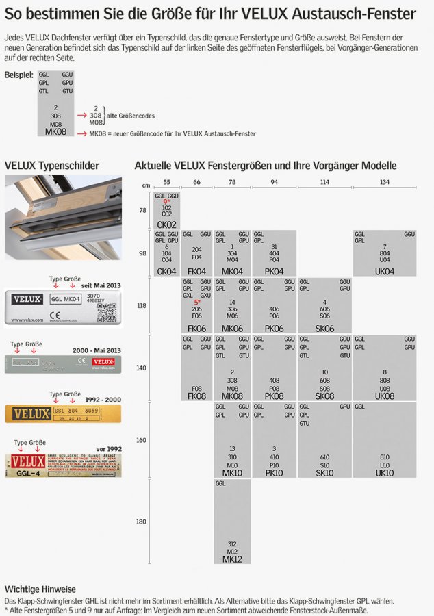 Der Größenraster (als PDF zum Downloaden) zeigt Ihnen übersichtlich, in welcher Vielfalt VELUX Produkte erhältlich sind. Sollten Sie ein älteres Dachflächenfenster austauschen wollen, können Sie hier mit dem Größencode die neue Bezeichnung finden.